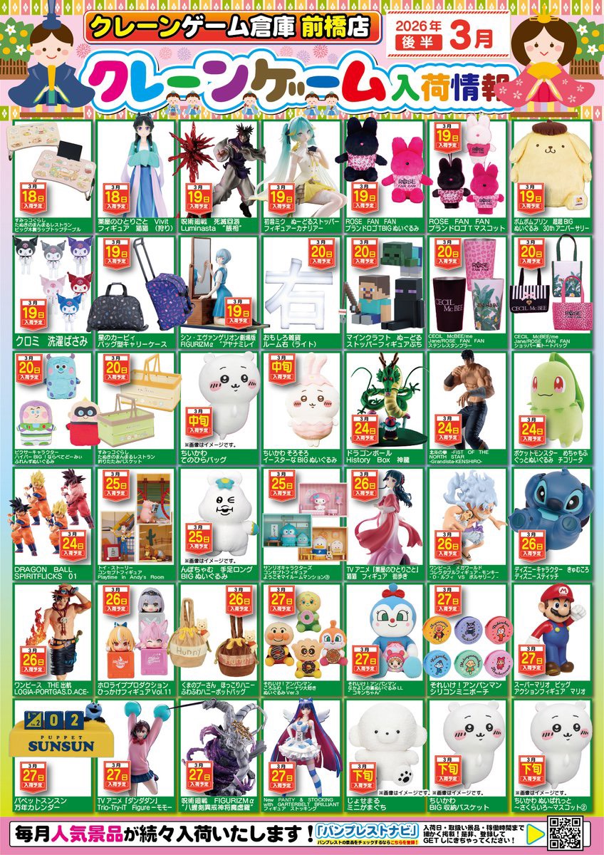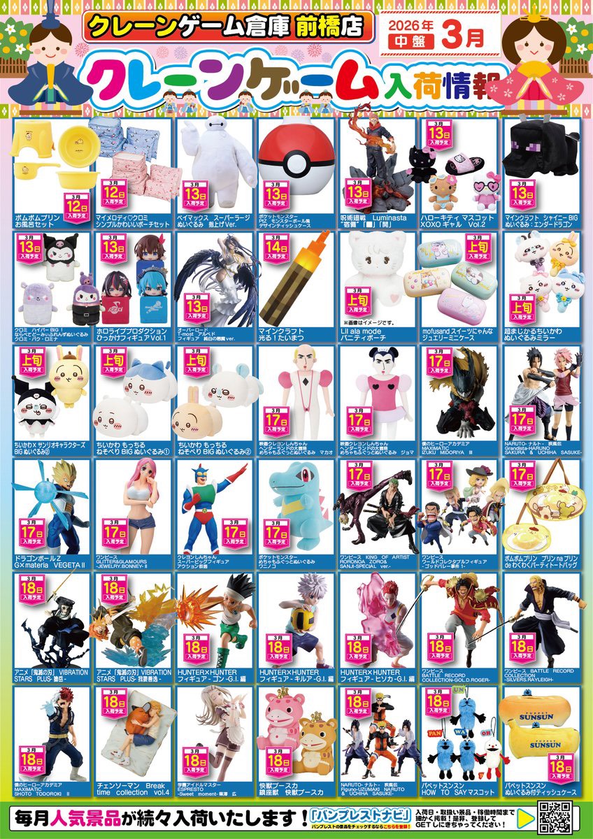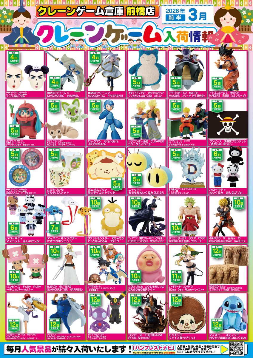 ★3月の景品入荷予定となります!★ アミューズ クレーンゲーム倉庫前橋店 2026年3月3日 お待たせ致しました☀️ クレーンゲーム倉庫前橋店 3月の景品入荷予定となります! ⚠️入荷月日変更、発売延期、発売中止等の可能性もございます⚠️