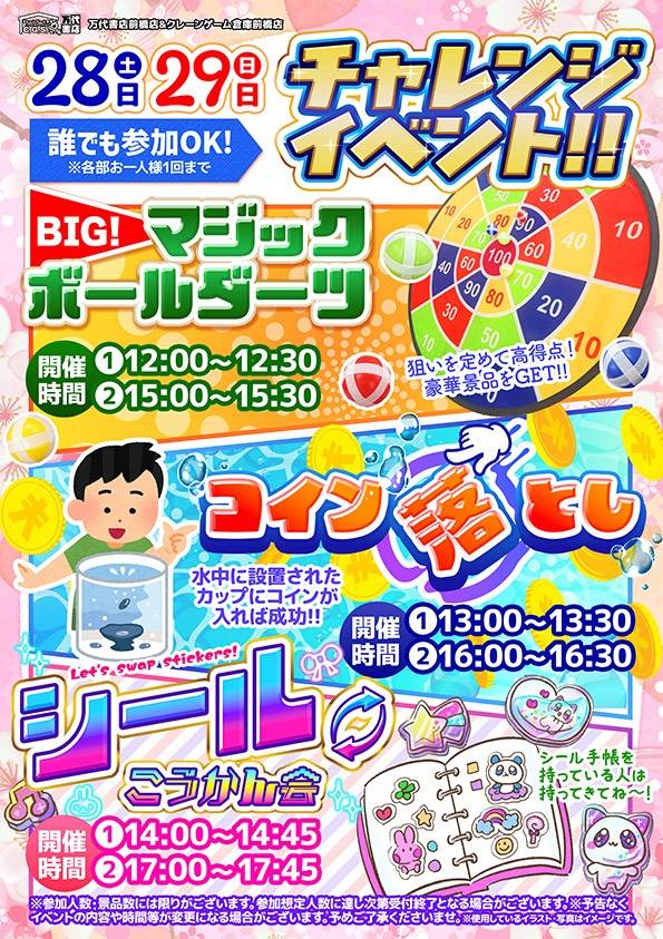 【3/28~3/29】チャレンジイベント開催!!《マジックボールダーツ・コイン落とし・シールこうかん会》