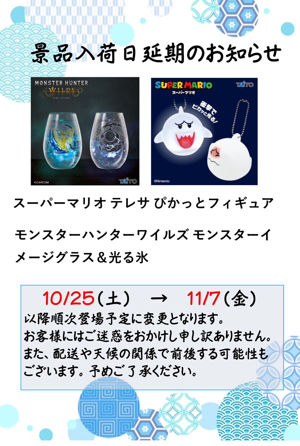 ■《10月25日⇒11月7日》景品入荷日延期のお知らせ■ お知らせ アミューズ 2025年10月29日 今月入荷を予定しておりました! モンハンイメージグラス&光る氷 テレサ ぴかっとフィギュア こちらメーカー都合により発売が延期となります。 延期後の発売日については下記の日程となります。 ご迷惑をお掛け致しますこと、お詫び申し上げます。