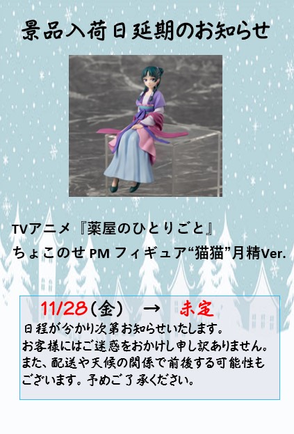 ■景品入荷日延期のお知らせ《薬屋のひとりごと ちょこのせPMフィギュア猫猫 月精Ver.》■ お知らせ アミューズ 2025年11月28日 今月入荷を予定しておりました 薬屋のひとりごと ちょこのせPMフィギュア猫猫 月精Ver. こちらメーカー都合により発売が延期となります。 延期後の発売日についてはわかり次第お知らせ致します。 ご迷惑をお掛け致しますこと、お詫び申し上げます。